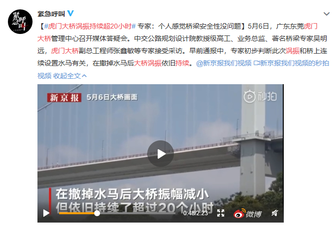 5月5日下午14時(shí)許,虎門大橋懸索橋橋面出現(xiàn)可感知的波浪般晃動(dòng),廣東交通集團(tuán)通報(bào):振動(dòng)系橋梁渦振現(xiàn)象,并認(rèn)為懸索橋結(jié)構(gòu)安全可靠,不會(huì)影響虎門大橋后續(xù)使用的結(jié)構(gòu)安全和耐久性。